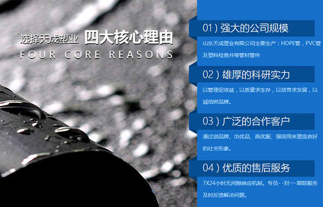 山东天成塑业有限公司主要销售:HDPE管,PVC管及塑料检查井等管材管件,产品广泛应用于市政、建筑,环保,石油、化工、电力、矿山,冶金、医药、